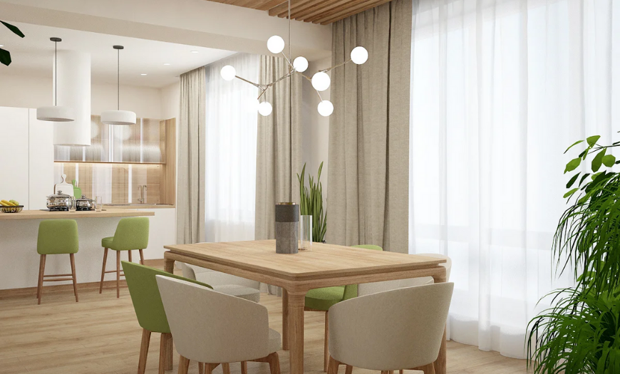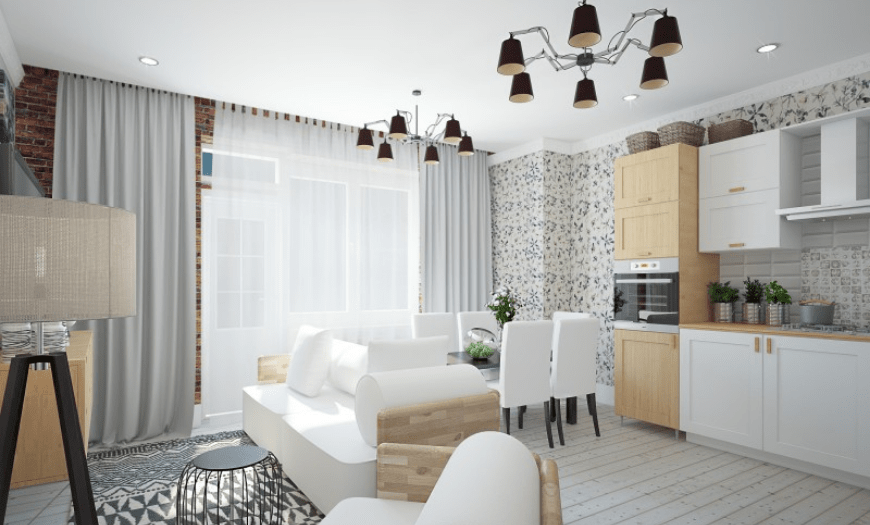 В оформлении гостиной, кухни и столовой использованы элементы скандинавского стиля