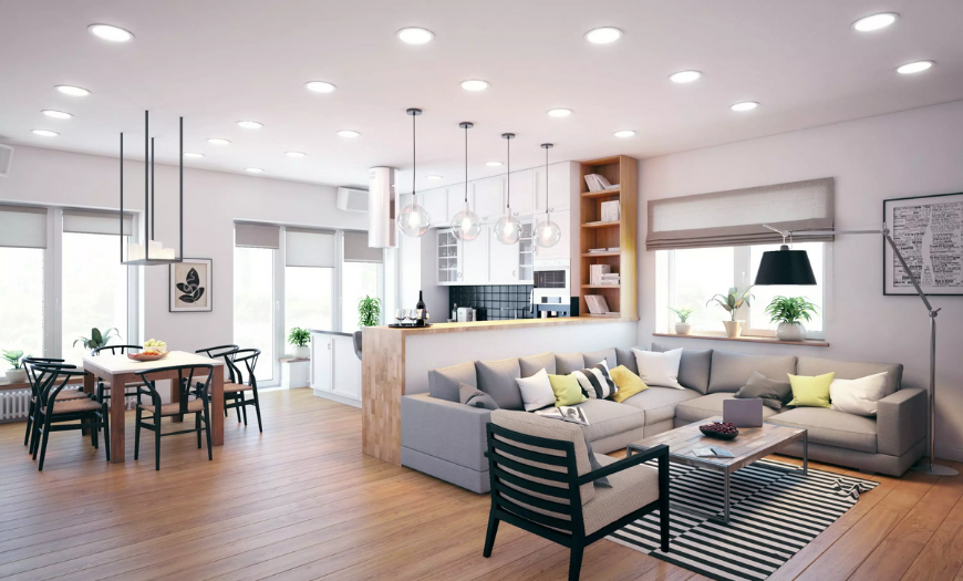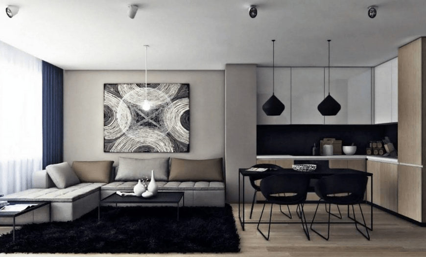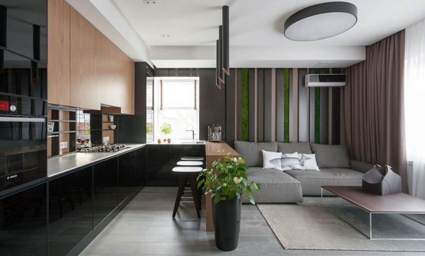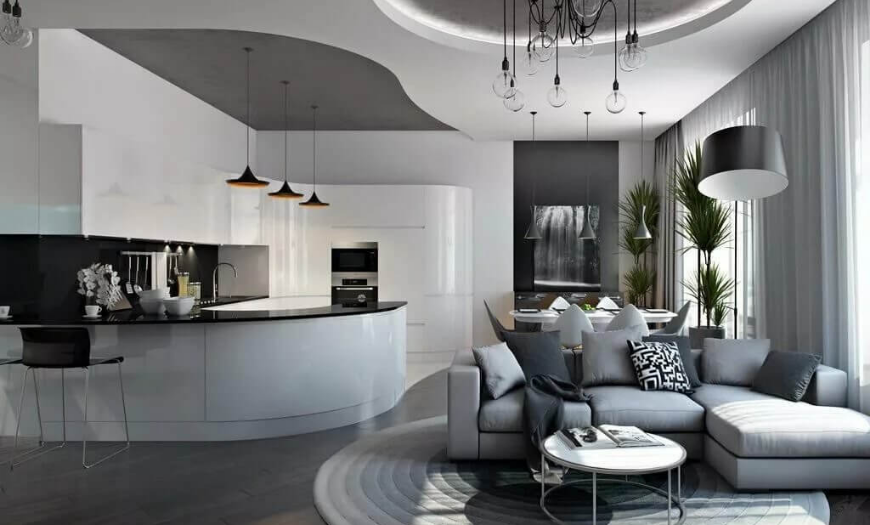 Чтобы помещение было не только стильным, но и функциональным, необходимо выполнить зонирование общего пространства. Существует множество дизайнерских приемов, когда кухня-гостиная становится максимально комфортной и удобной.
