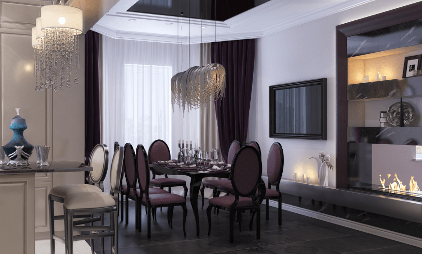 Особенность – акцент по центру помещения. Можно сделать там обеденную группу или диван, а также дополнительное освещение. В таком дизайне актуально будет смотреться ступенчатый потолок, мраморный пол, фартук черно-белого окраса и стулья в форме геометрических фигур.