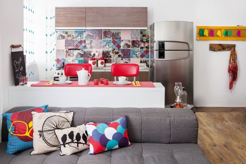 Компактная кухня визуально отделена от остального пространства барной стойкой и холодильником