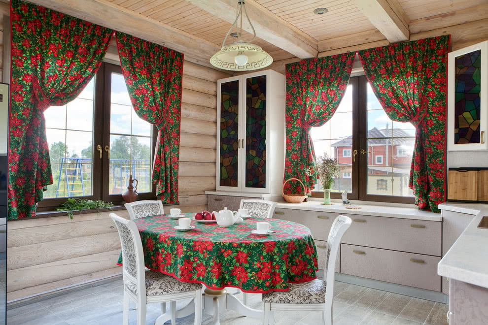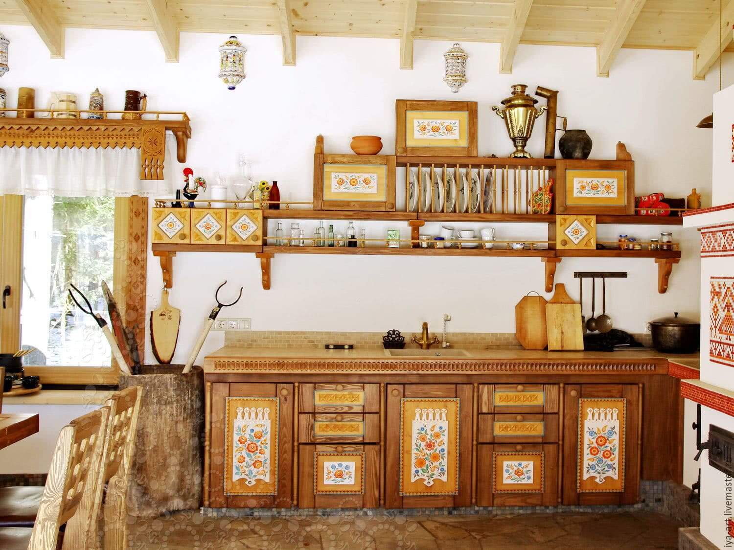 Предусматривает вид старинной русской избы. Обязательно должна быть печь. Стены не стоит красить или покрывать обоями, лучше оставить деревянными в натуральном цвете. Это придаст большей изысканности дизайну кухни на даче. Пол тоже лучше ничем не покрывать (разве что лаком) и оставить деревянным. На стол можно поселить длинную скатерть, а рядом поставить стулья в тканевых чехлах под цвет скатерти (желательно белого цвета).