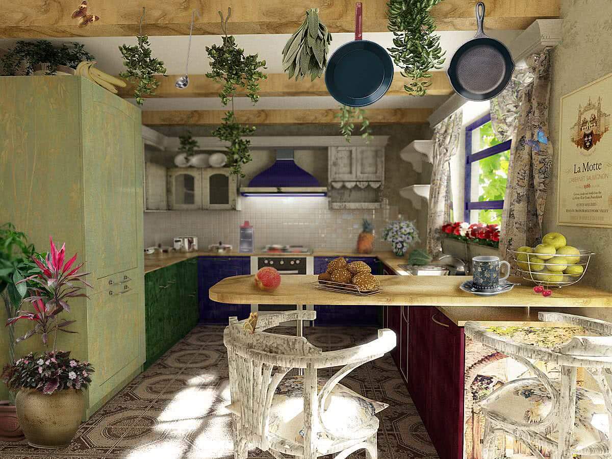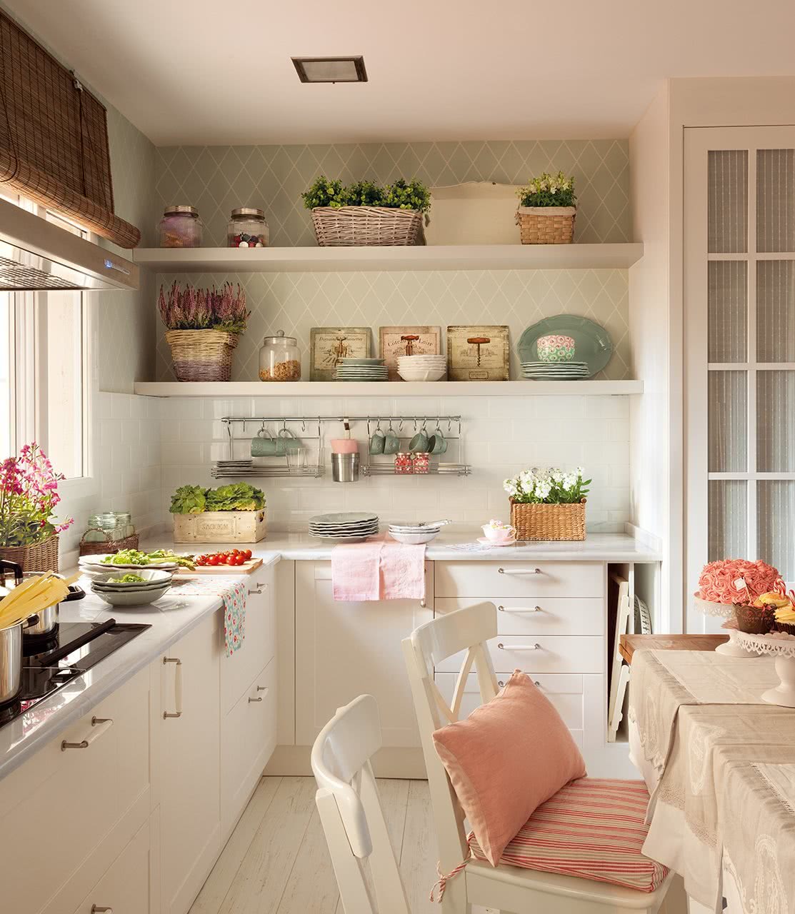 Придаёт воздушность и лёгкость. В нём преобладают цветочные принты. Стены в нежных, пастельных тонах. Так помещение выглядит светло, нежно. Шторы на окна лучше подбирать воздушные, с рюшами, в нежных оттенках. На диван (если он присутствует) можно добавить несколько небольших, декоративных подушек. Так кухня будет обладать уютом и нежностью.