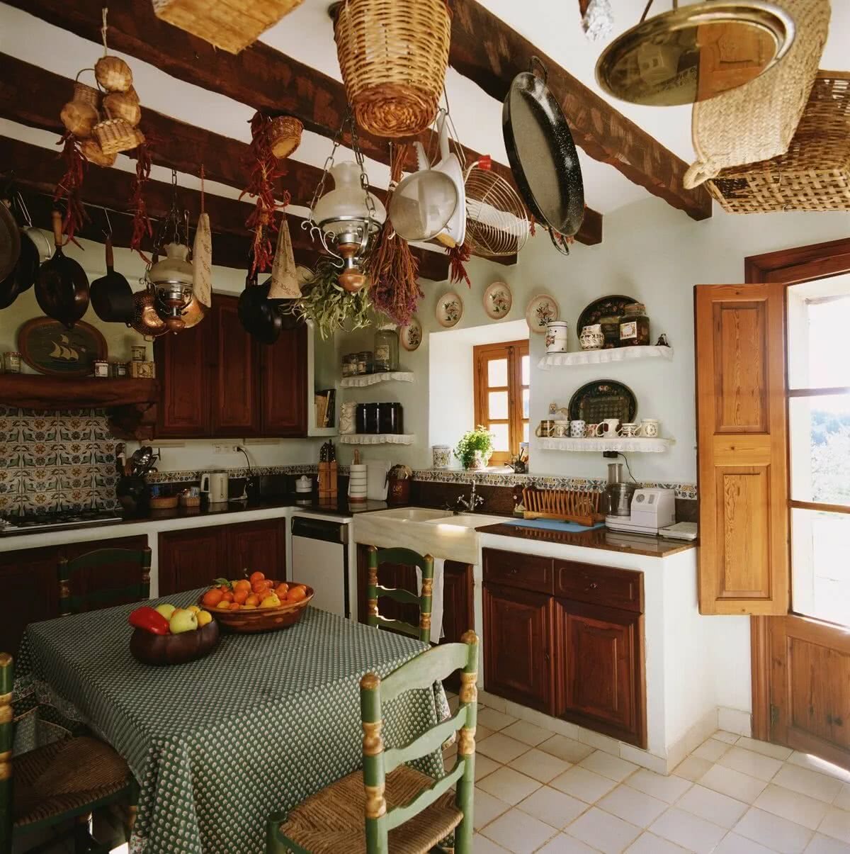 Вьющиеся декоративные растения, посаженные по периметру, будут создавать тень внутри кухни. А креативные полочки и перегородки, расположенные вдоль стены или в проемах, создадут необходимый дачный антураж.
