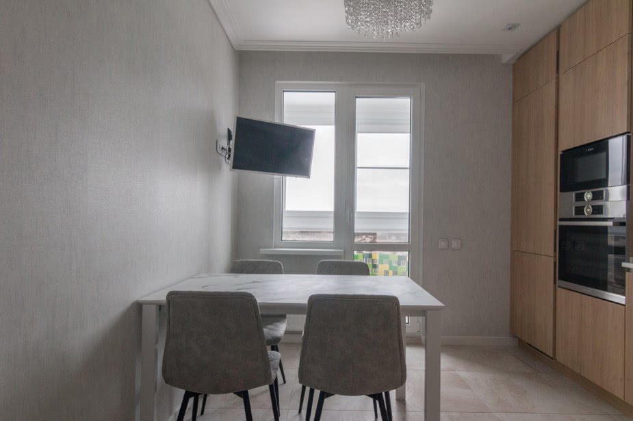 А вот и более традиционное решение. Снос стен с выносом столовой на балкон — настоящее спасение для крохотных кухонь в панельных квартирах. Современный стиль оформления, обилие света и, конечно же, дополнительное пространство, которого так не хватало.