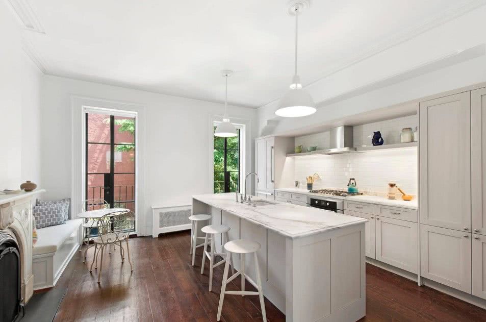 Не нужно отказываться от задуманного — такое несоответствие элементарно обыгрывается в интерьере. Если позволяет площадь, оформляйте большую кухню-гостиную в классическом стиле с кухонными островом и камином.