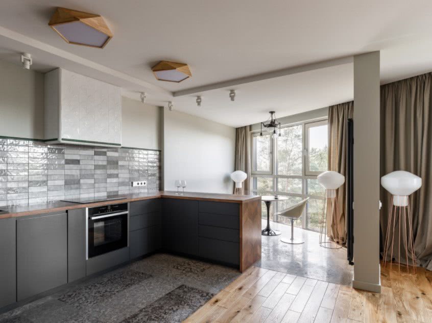 Во втором варианте перепланировки между кухней и балконом обустраивается перегородка в виде вместительного комода, «острова» или барной стойки, которые в большинстве примеров разделяют общую квадратуру на функциональные зоны.