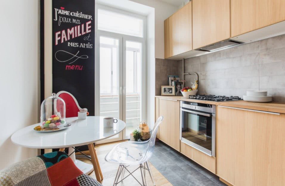 Дополнительное пространство балкона станет отличным местом для холодильника, а перегородка в виде стола или барной стойки прекрасно заменит объёмный обеденный стол и освободит пространство для уютного небольшого диванчика.