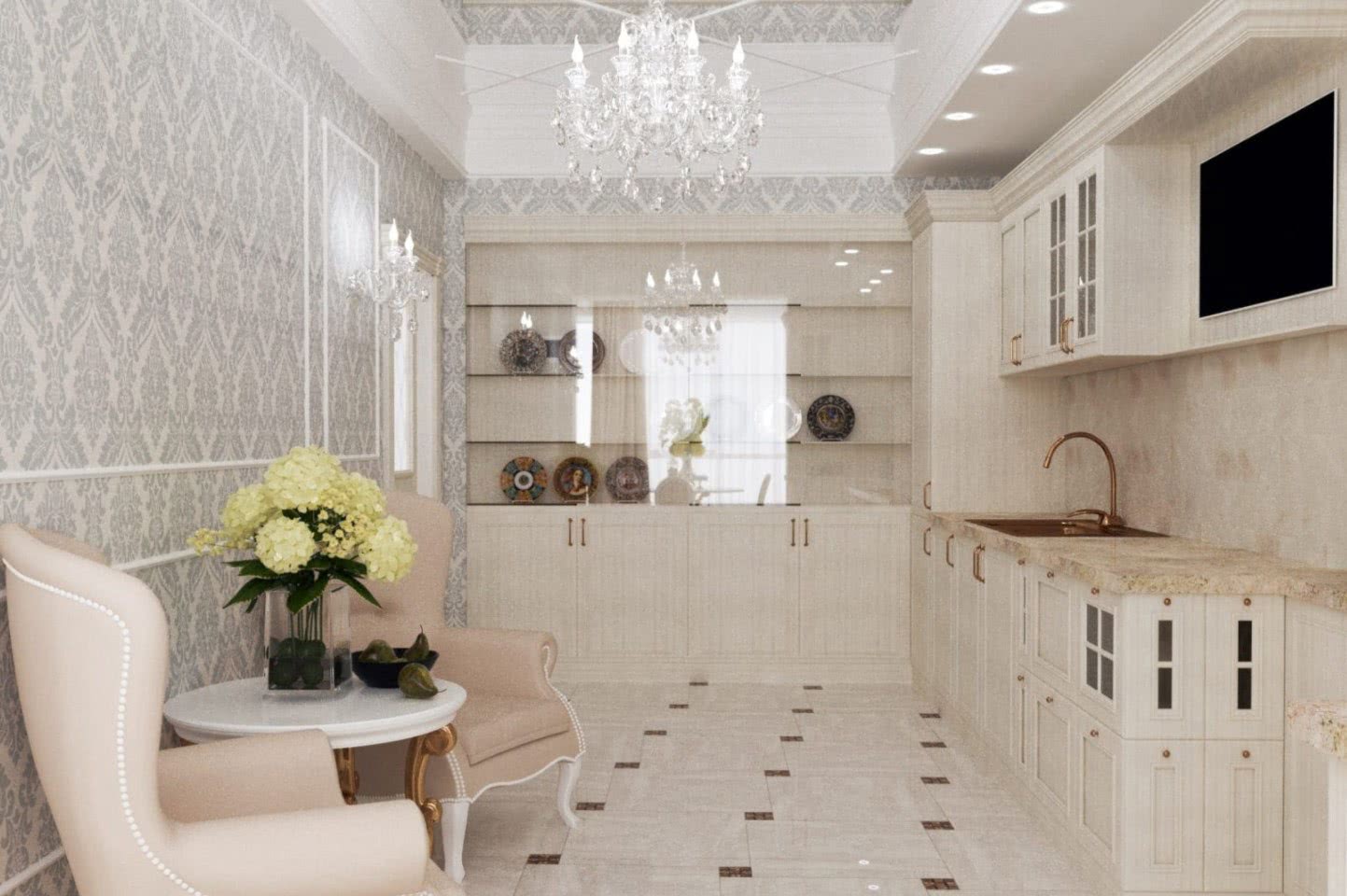 Мебель здесь часто перекликается с провансом — резные элементы и пастельные тона, но, в отличие от него, дополняется шикарной кожаной обивкой. Либо парчовыми вставками.