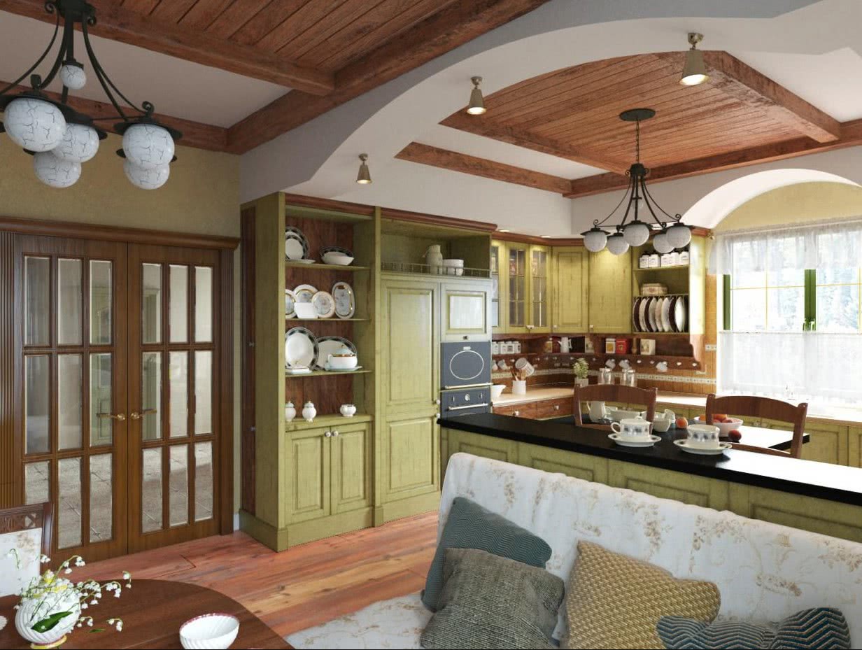Отсюда и бревенчатые своды, потолки, частые балки с отделкой. В домах со скатной крышей оборудовать кухню под кантри будет уместнее всего.