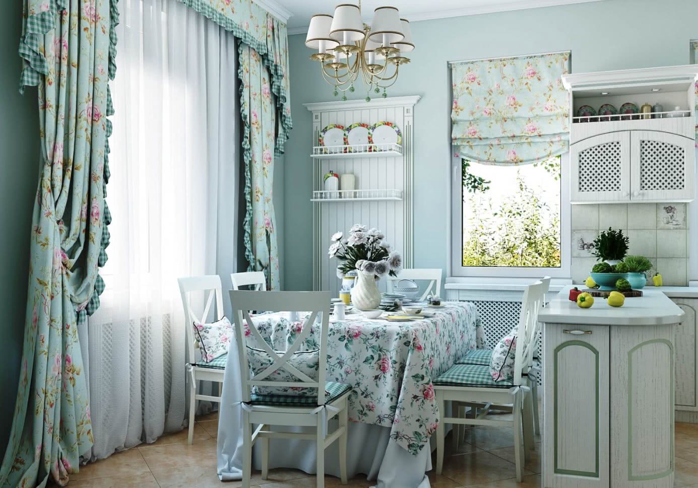 Прованс воплощается в светлой и сглаженной пастельной гамме. Мебель имеет характерные резные вставки, на занавесках и текстиле присутствуют флористические декоры.
