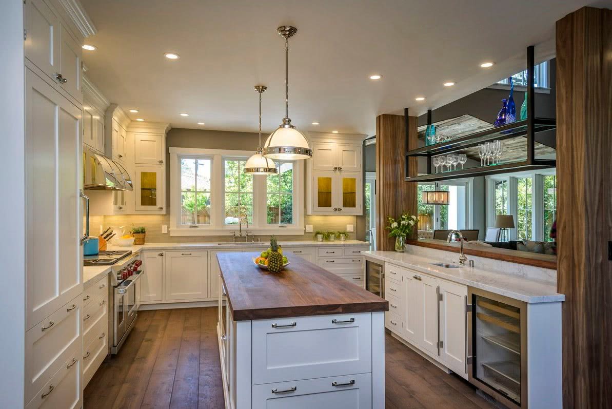 Большие помещения с двумя окнами могут себе позволить более облегченный интерьер, не перегруженный обилием подвесных шкафов. Места достаточно, чтобы расставить мебель по правилам выбранного стиля.
