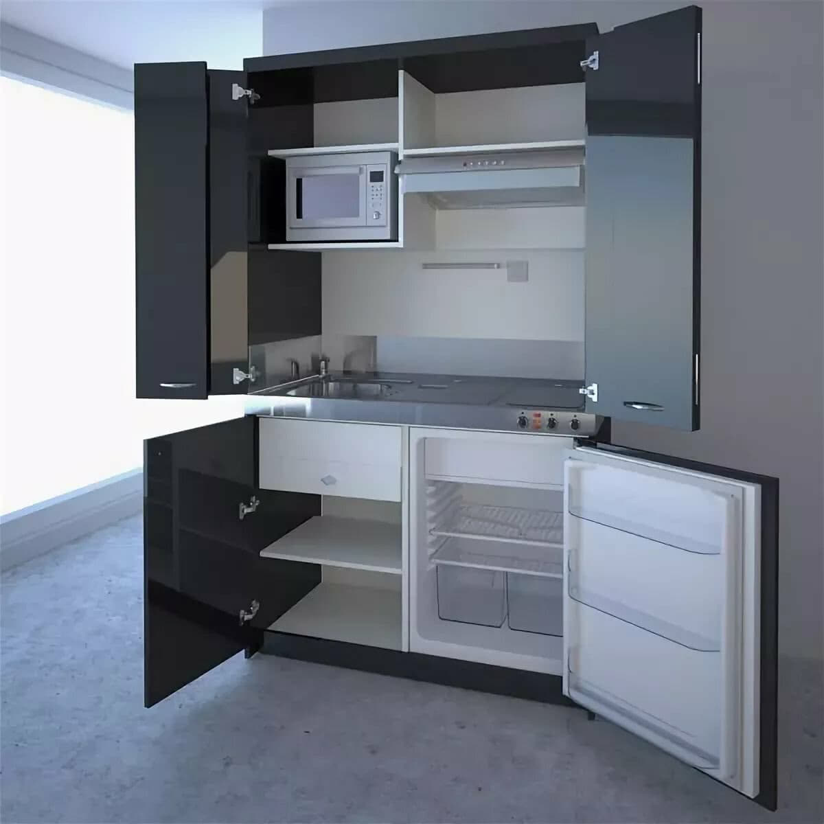 Идеально оформить небольшую кухню в студии в направлении модерн. Интерьер выиграет в свете зеркальных поверхностей, организованных пластиком, хромом, разным стеклом. Всё это обыгрывается плавной геометрической формой мебели и аксессуаров.