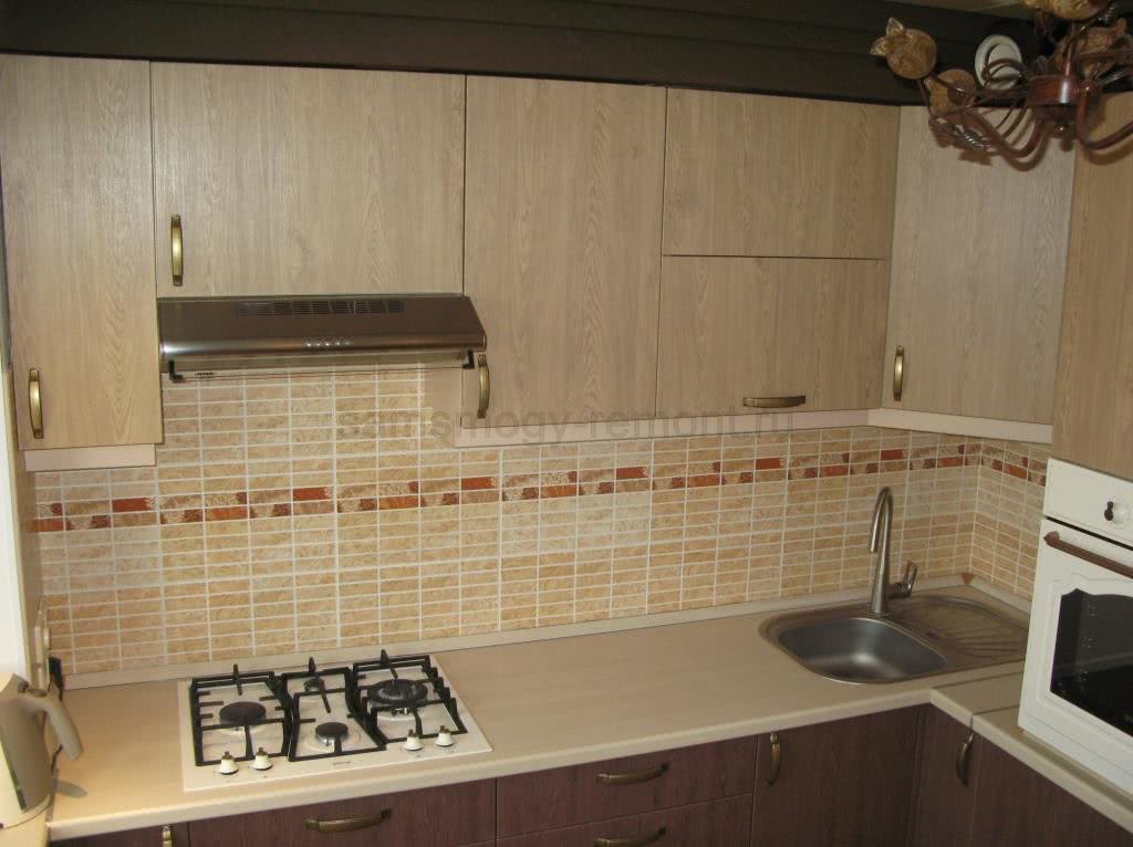 Это простая инструкция, как собрать новую кухню своими руками: установить шкафы, сделать корону для навесных шкафчиков и наклеить плитку на стену.