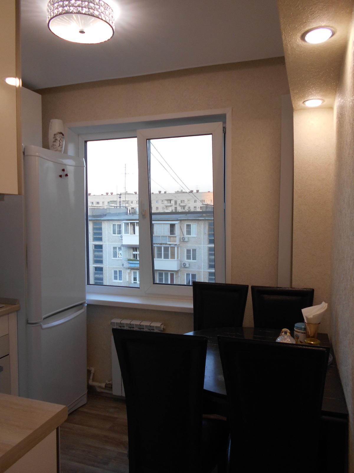 А это кухня 5,5 кв.м. в хрущевке. Как и на примерах выше, холодильник спрятан в нишу, а подоконник стал продолжением кухни.