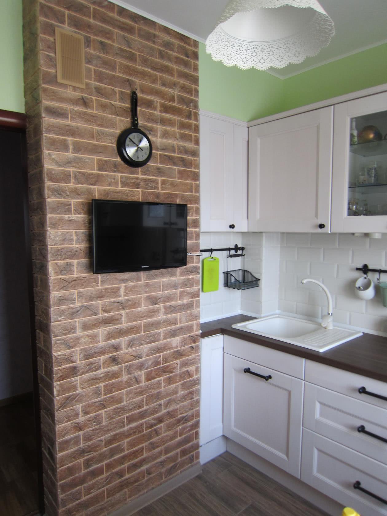 На малогабаритной угловой кухне до 6 метров можно даже вместить небольшой телевизор! Как? Очень просто: оставить в гарнитуре подходящую по размерам нишу.