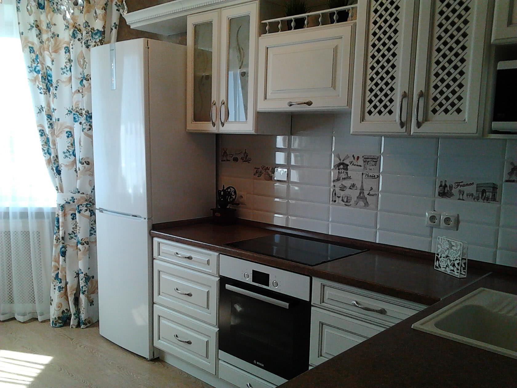 Бежевая кухня 6 кв.м. ценой 3200$ со встроенным холодильником. Не жалейте выносить дополнительные розетки — лишним не будет точно.