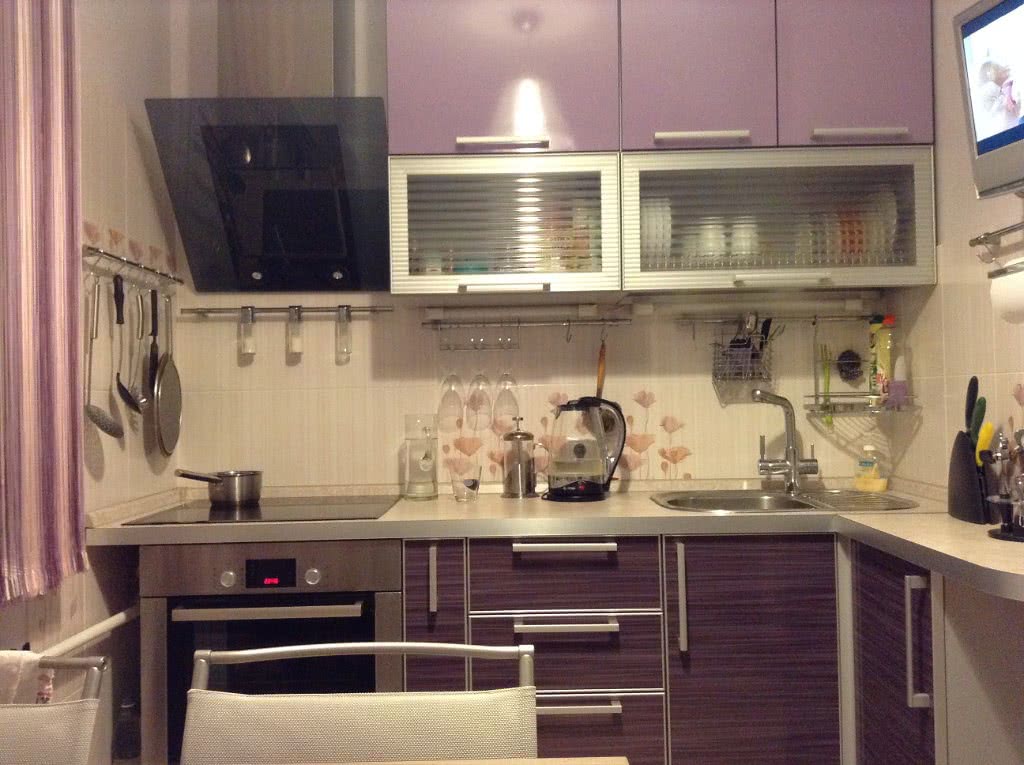 На малогабаритной угловой кухне до 6 метров можно даже вместить небольшой телевизор! Как? Очень просто: оставить в гарнитуре подходящую по размерам нишу.