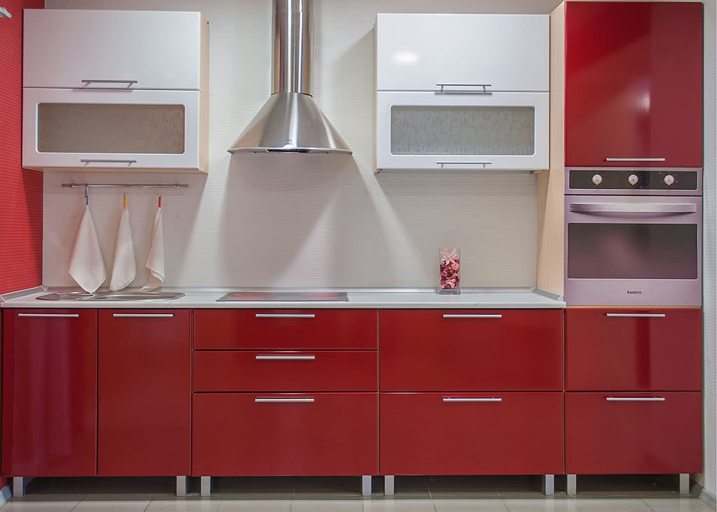 И не стоит бояться ярких цветов! К тому же глянец позволит хоть немного, но расширить пространство малогабаритной кухни.