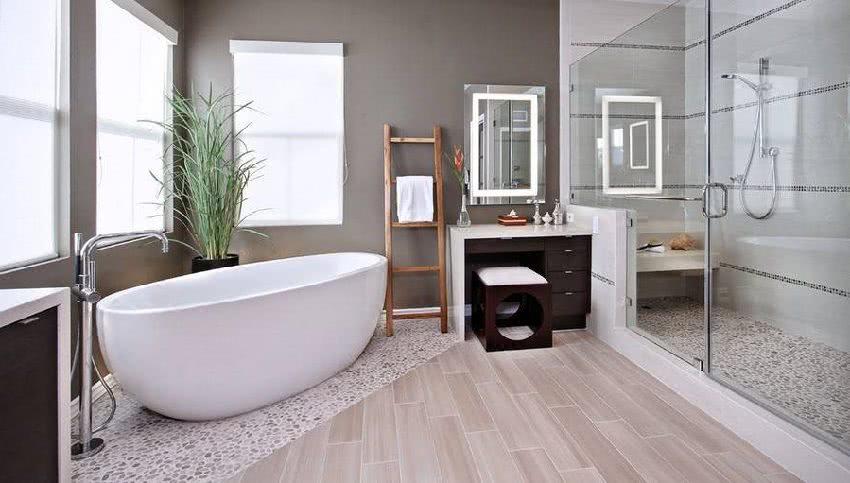 Ламинат для ванной комнаты требует особого внимания при выборе. Здесь будут уместны только те варианты, для которых в качестве основы использовались ПВХ плиты, не впитывающие воду. Это придает ему дополнительные водоотталкивающие свойства, которые позволяют достаточно долго контактировать с влагой, не деформироваться и не терять свой привлекательный внешний вид. Современные технологии позволяют придать ламинированным панелям характеристики, близкие к кафелю.