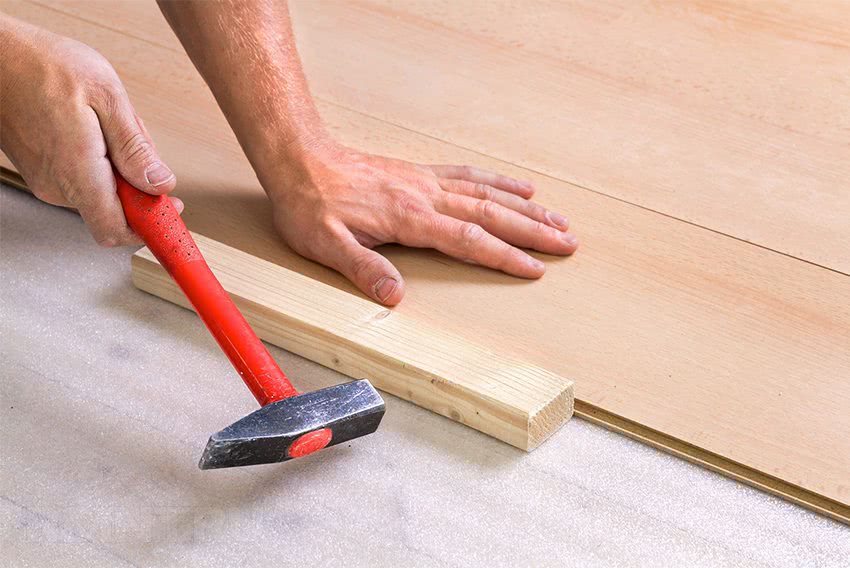 - предварительно утапливают шляпки крепежных изделий внутрь пола с помощью молотка;