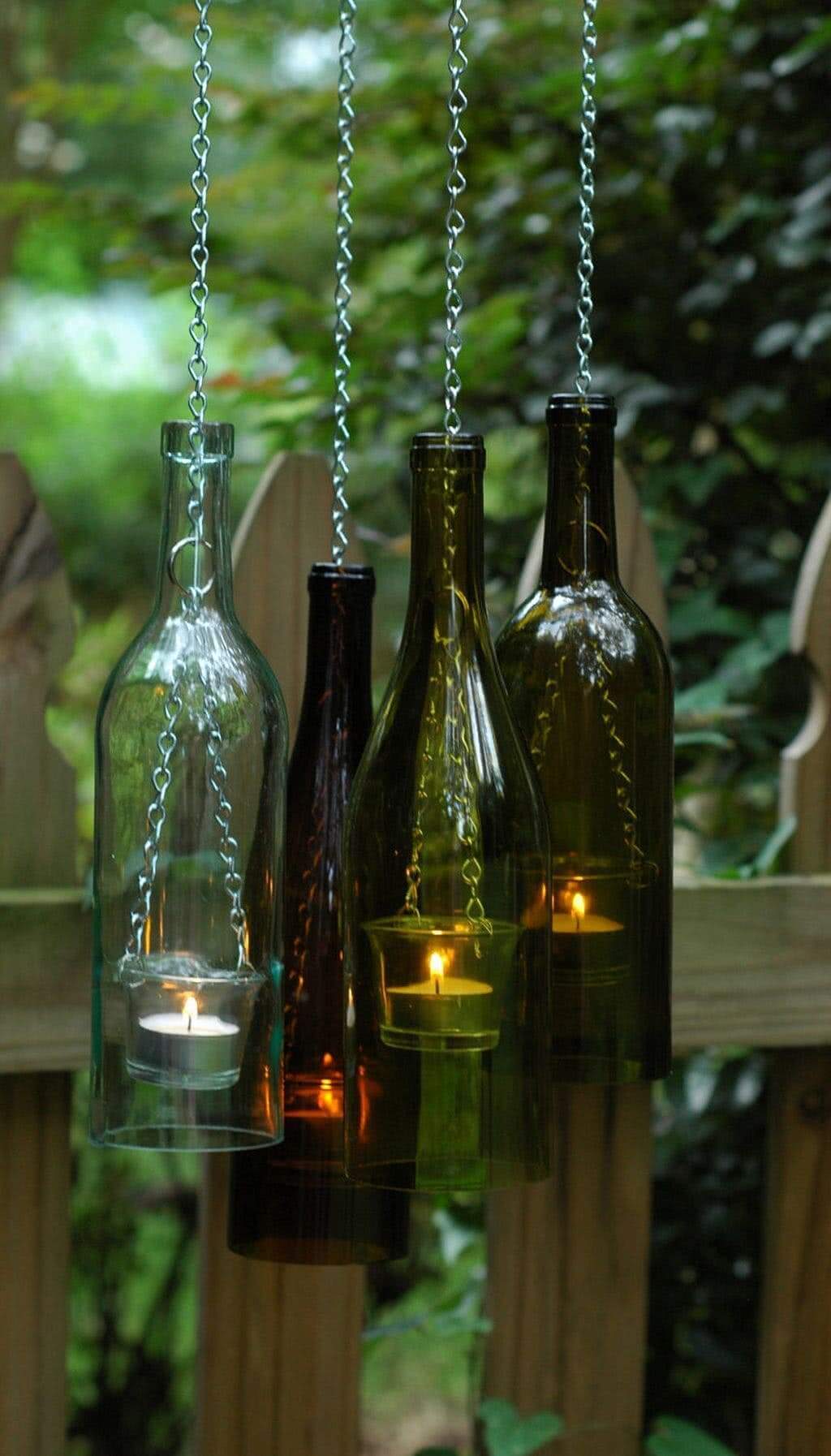 В качестве украшения сада частного дома экзотично выглядят люстры из стеклянных бутылок из-под вина и шампанского, подвешенные на металлический каркас.