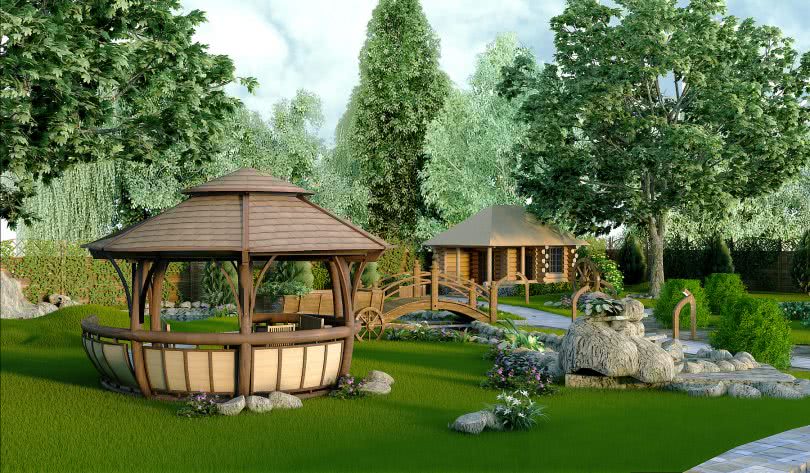 Чтобы все разместить на плане загородного дома, нужно зонирование. Парадный вход – это лицо участка, место у коттеджа декорируют цветниками и газонами. Далее лучше расположить фруктовые деревья, рядом с которым гармонично смотрится островок для отдыха. Резные беседки или лавочки под живыми арками навевают романтичное настроение.