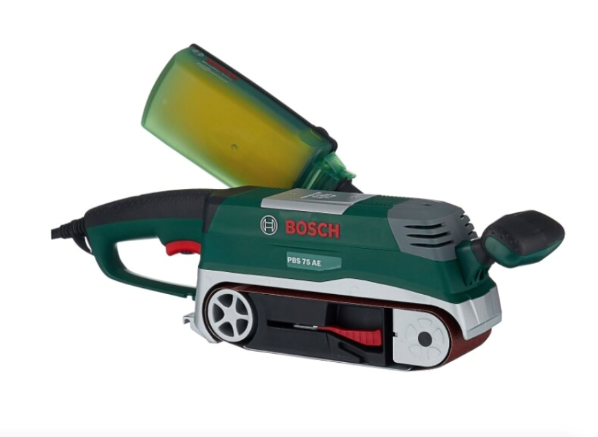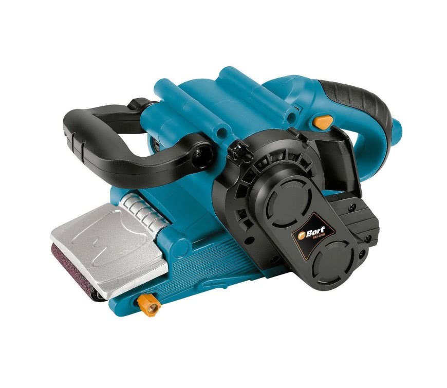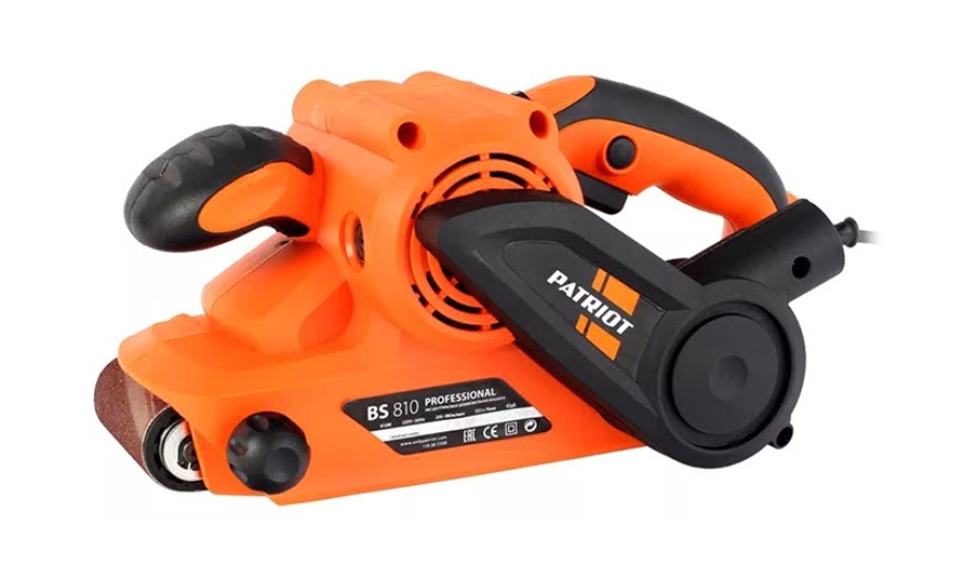 Мощная шлифовальная машинка с широкой лентой предназначена для обработки больших поверхностей. Хорошо справляется с деревом, композитом и мягким металлом. Длинный кабель не сковывает движений, в передней части есть дополнительная рукоять.