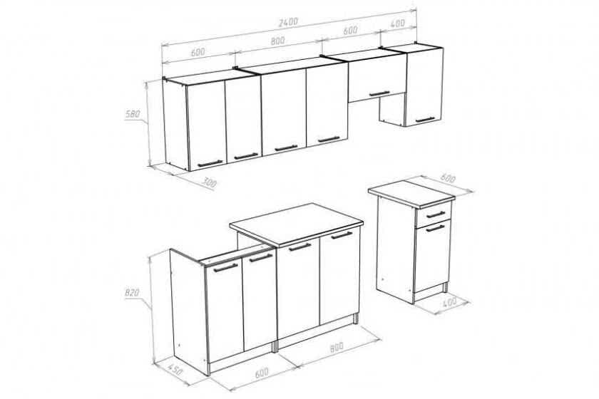 Ценовая политика готовой модели зависит от количества используемых мебельных элементов. Так кухонный гарнитур Орех длиной 2,4 м, состоящий из 7 ящиков (3 напольный + 3 навесных + шкаф над вытяжкой) обойдется без малого 17,7 тыс. рублей.