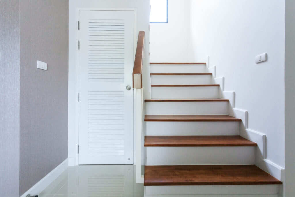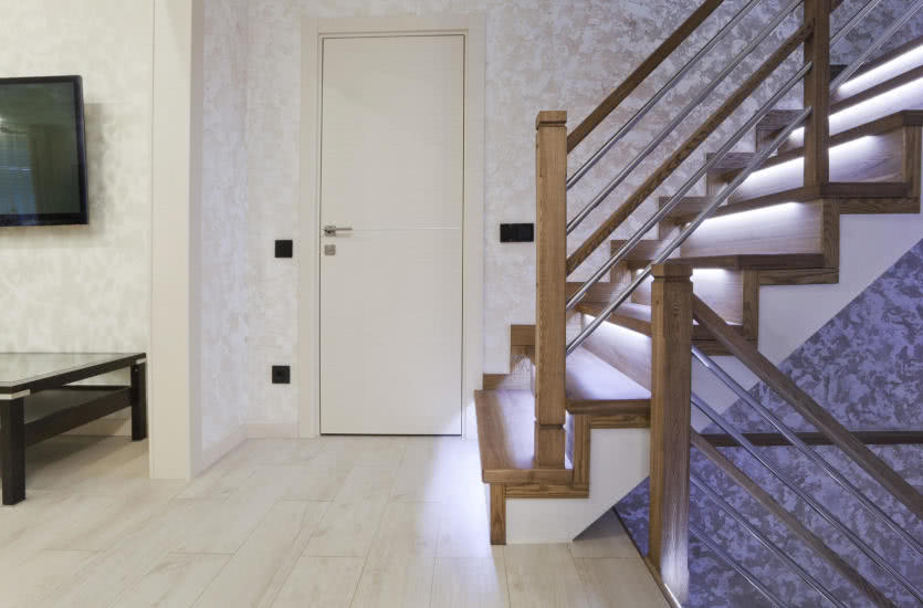 Ширину лестницы обычно соотносят с размером дверного проема. Стандартным размером межкомнатной двери принято считать величину 70-80 см. К этому размеру надо добавить ширину наличников, чтобы проем «аккуратно» вписывался в лестницу. Получается, что оптимальная ширина лестницы для частного дома равна 90-100 см. Но этот параметр не жесткий, и если дизайн интерьера выполнен в стиле минимализма или хай-тек, то ширину лестницы можно минимизировать до начальных 70-80 см.