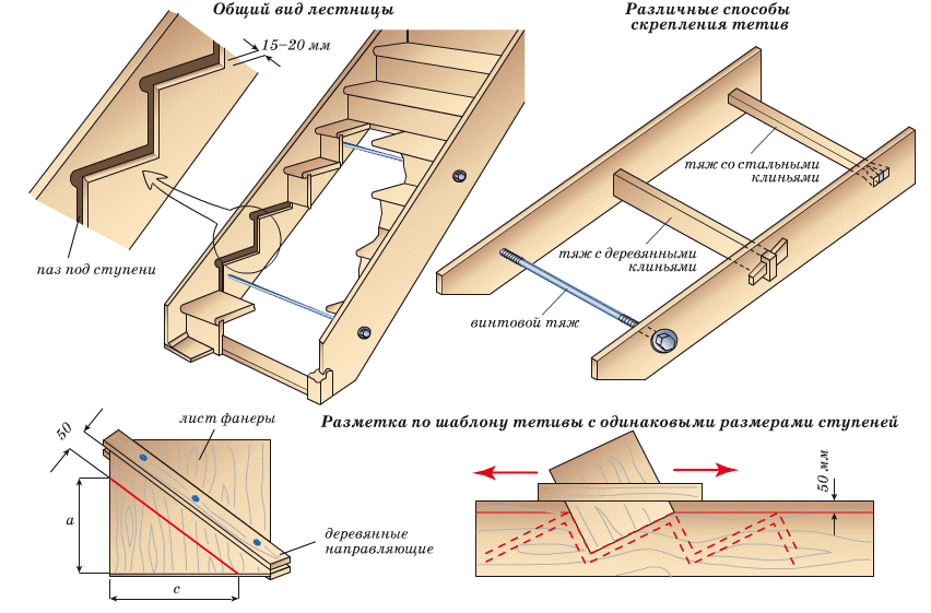 Очень важно разметить правильно опорные балки, чтобы они были абсолютно одинаковые, иначе лестничный пролет окажется перекошенным. Для них следует выбирать прочный и выдержанный массив стандартной влажности