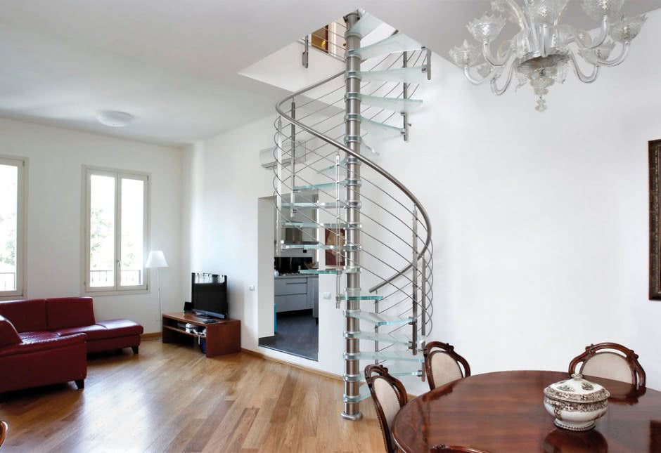Такая конструкция отличается меньшей функциональностью, однако при этом она занимает намного меньше полезного пространства. А это именно то что нужно, если помещение небольшое, но внутри него всё же необходимо разместить лестницу. При этом комната с такой лестницей приобретает удивительный внешний вид.