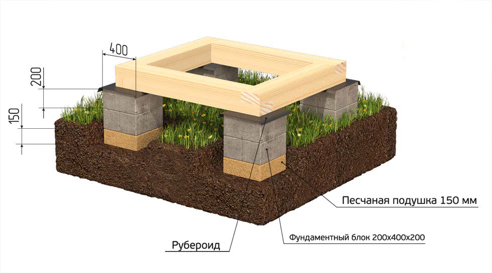 Более надежной будет конструкция, основанная на ленточном фундаменте или кирпичных столбиках, которые будут держать всю нагрузку от постройки. Ленточный фундамент в данном случае предпочтительнее, поскольку он выдерживает большую нагрузку и способен держать на себе пенобетон, кирпич или камень.