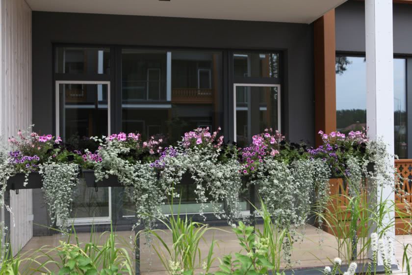 - ампельные цветы для ящиков на перилах или кашпо, подвешенных к потолку;