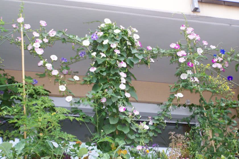 Вертикальные цветники вполне можно организовать на балконе небольшого размера. Горшки с цветами фиксируют на веревках, устанавливают на специальных лесенках или в сеточных шпалерах. Чтобы украсить балкон таким образом можно использовать девичий виноград, вьюн, луноцвет, лимонник или душистый горошек.