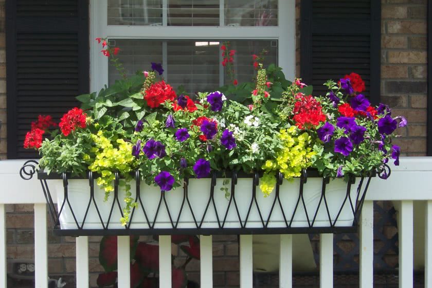 Ящик может быть подвесным с держателями или обычным, размещающимся на подставке. Сейчас также можно приобрести «дом» для цветов с особой формой закрепления на ограждении балкона как на фото.