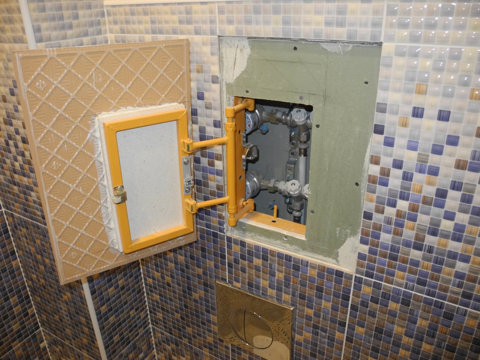 Когда все значимые запорные, регулирующие и водоразборные устройства замаскированы за фальшь-стеной, но сосредоточены в одном месте, соорудить люк для доступа к ним намного легче. Дверца будет отличаться большими размерами, однако это не повредит ни внешнему виду перегородки, ни функциональности люка.
