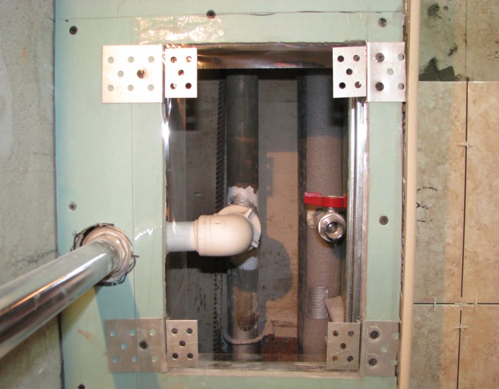 Однако возникает новая проблема – к трубам, счетчикам, кранам, фильтрам, гидрозатворам сифонов раковин, душевых кабин, ванн, бачкам унитазов необходимо обеспечить доступ. Поэтому в системах ГКЛ/ГВЛ оставляют проем, монтируют люк под металлическую ванну для последующей отделки кафелем, мозаикой в едином стиле со всей стеной, экраном.