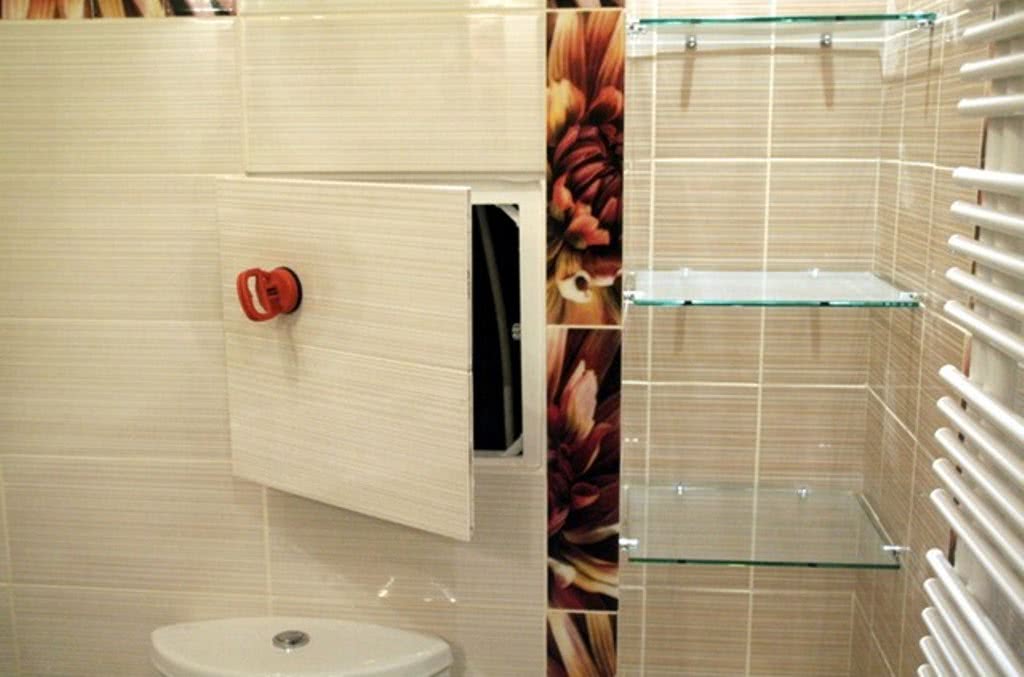 Замаскирован люк для сантехнического шкафа может быть керамической плиткой, мозаикой или плиткой, имитирующей натуральные материалы.