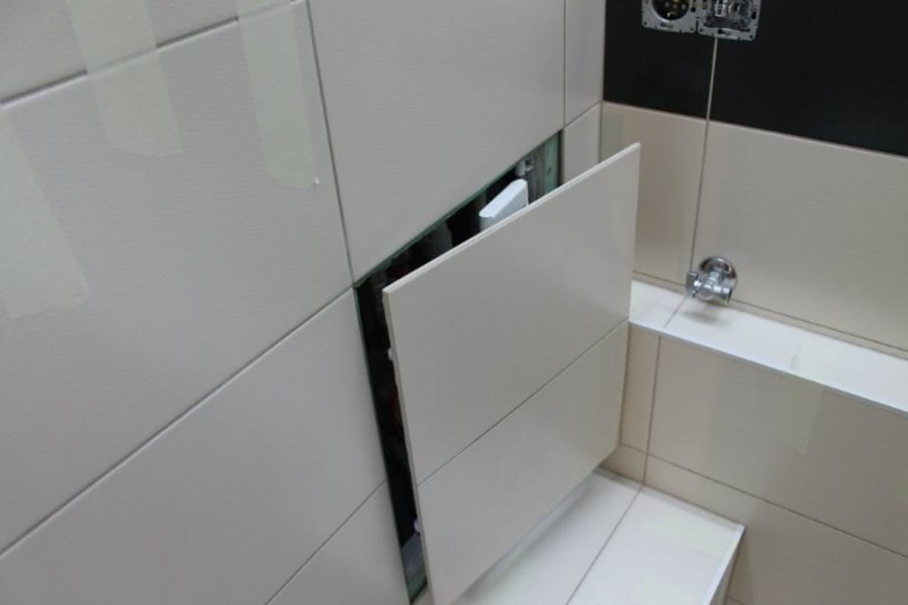 С учетом этих требований не только подбирается модель и размеры люка, но и корректируется его положение на стене. В зависимости от размещения плитки во время разбивки конструкция может немного перемещаться в любую сторону, за чет этого исключается нарушения рядов. Во время перемещения люка нужно следить, чтобы все коммуникации оставались доступными.