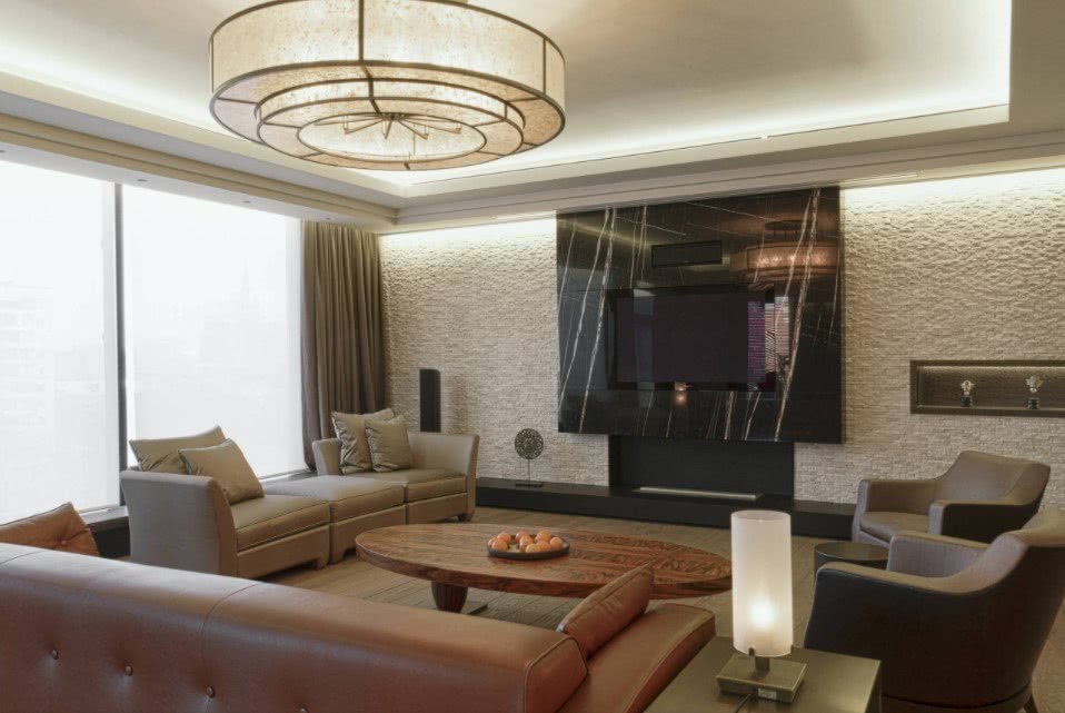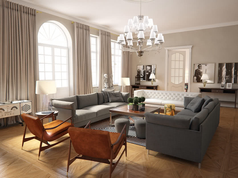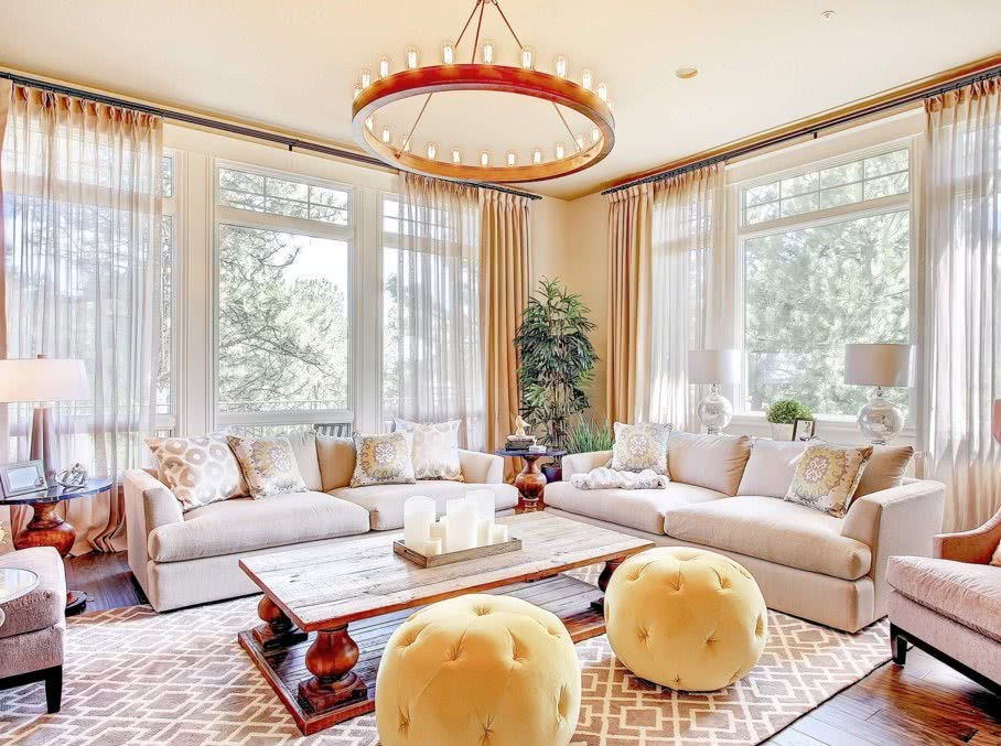 На любом фото люстры в гостиной почти всегда достаточно объемные, эффектные и дают яркий свет. Разумеется, это не случайность.