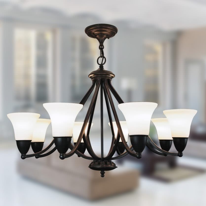 Такие люстры особенно удобны тем, что их легко обыграть в интерьере даже самого деревенского типа — достаточно просто подобрать подходящий абажур, и проблема решена.