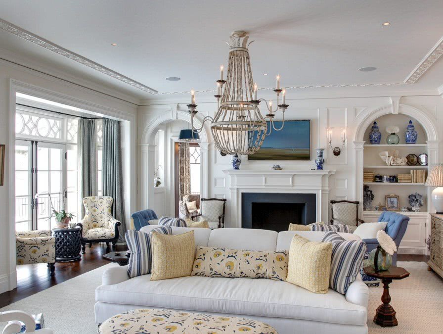 Для большинства традиционно используемых стилей, от кантри до прованса, подойдут подвесные люстры для гостиной, если, конечно, позволяет высота потолка.