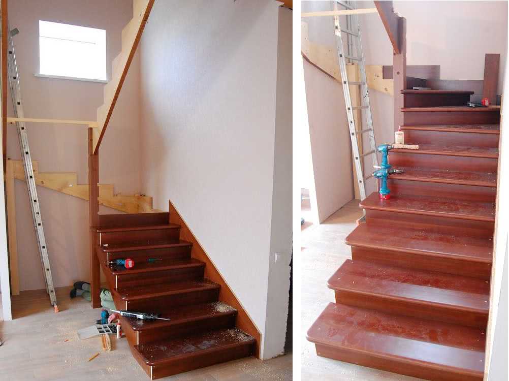 Компактные варианты лестничных пролетов имеют небольшие подступенки. Для того чтобы скрыть изъяны самостоятельной сборки или немного изменить внешний вид лестницы, расстояние между подступенками можно забить тонкими рейками.