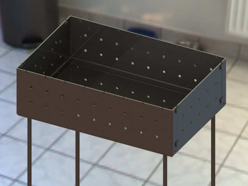Состоит из вертикальной жаровни прямоугольной или квадратной формы, выполненной из перфорированного металла толщиной 2-3 мм или прочной сетки, поддона-золосборника, а также кронштейнов с прорезями для установки шампуров или решетки с 2-х, реже — с 4-х сторон. Преимущество данной модели — простота и компактность. Такой мангал вмещает от 6 до 24 шампуров.