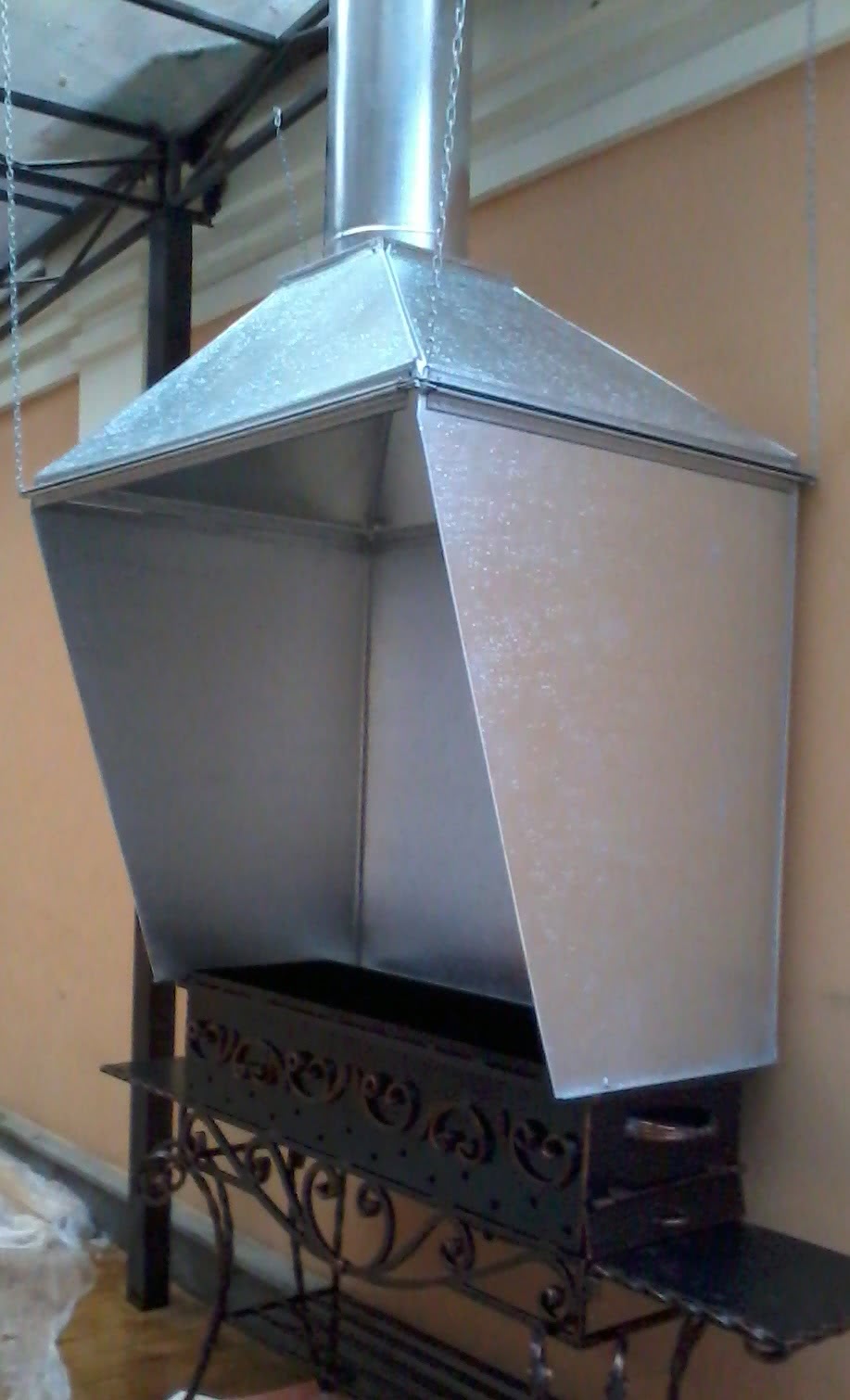 Для большинства стационарных сооружений прекрасно подойдет вытяжной зонт. Принцип его действия состоит в сборе продуктов горения и направлении их в трубу. Он должен иметь почти идеальную гладкость, потому как даже при незначительных шероховатостях тяга начинает ослабевать. Поэтому лучше приобрести или сделать своими руками металлический или стальной зонт. Такой дымоход надежен и эффективен, к тому же собирает меньше жира и сажи.