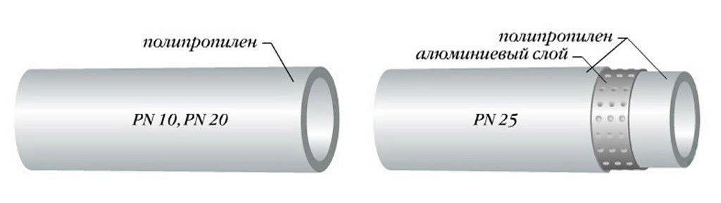 PN25. Это изделие имеет принципиальное отличие от предыдущих типов, поскольку армировано фольгой из алюминия или стекловолокном. По свойствам армированная труба схожа с продуктами из металлопластика, менее подвержена температурному воздействию, выдерживает 95 градусов. Предназначена для использования в системах отопления, а также в ГВС.