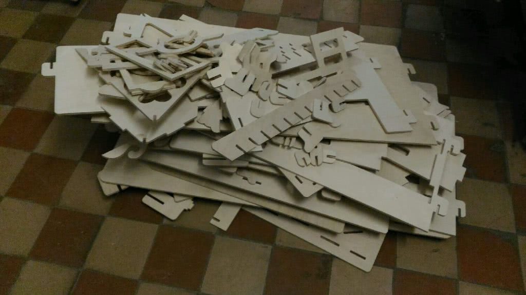 2)С помощью лобзика выпиливаем из фанеры заготовки для будущего домика. Не забудьте сразу прорезать окна и двери там, где это необходимо.