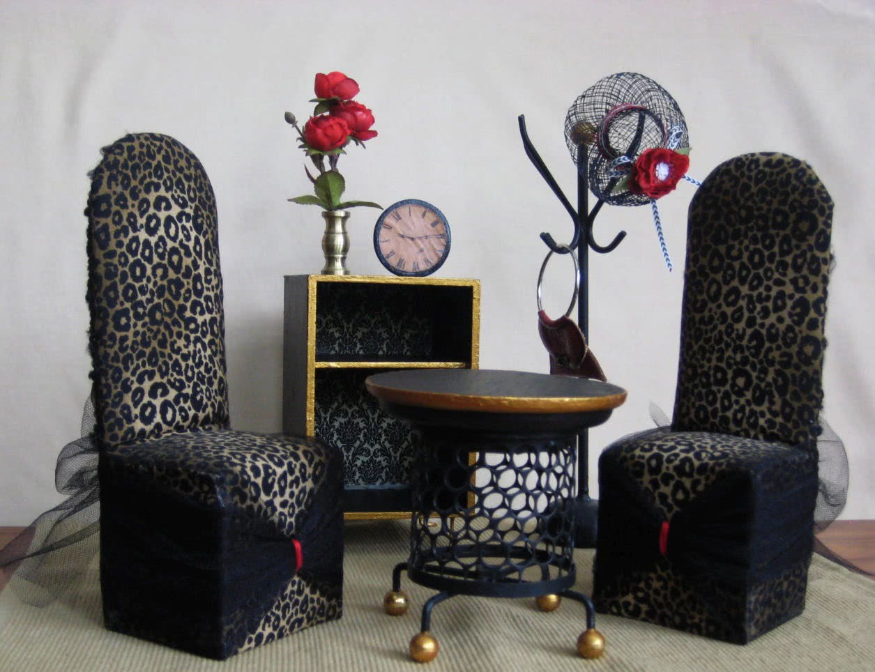 Несколько стульев позволят создать фантастические атрибуты волшебного замка. Основной акцент дизайна стульев зависит от цвета и фактуры обивки сидения. Чем темнее, тем более мистические варианты сделаете. Тёмные оттенки фиолетового, изумрудного или синего цвета больше подойдут для волшебных кукол Монстер Хайт, чем для гламурной Барби или доброй феи. Розовые, кремовые, красные тона позволят создать гламурное или винтажное изделие, дополненное круглым серебристым столиком на ножке, а цветастая ткань создаст неповторимый старинный колорит.