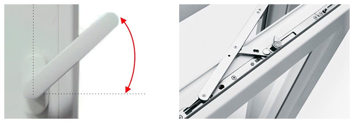 - Вверх под углом в 45 градусов, створка приоткрывается, оставляя щель для притока воздуха.