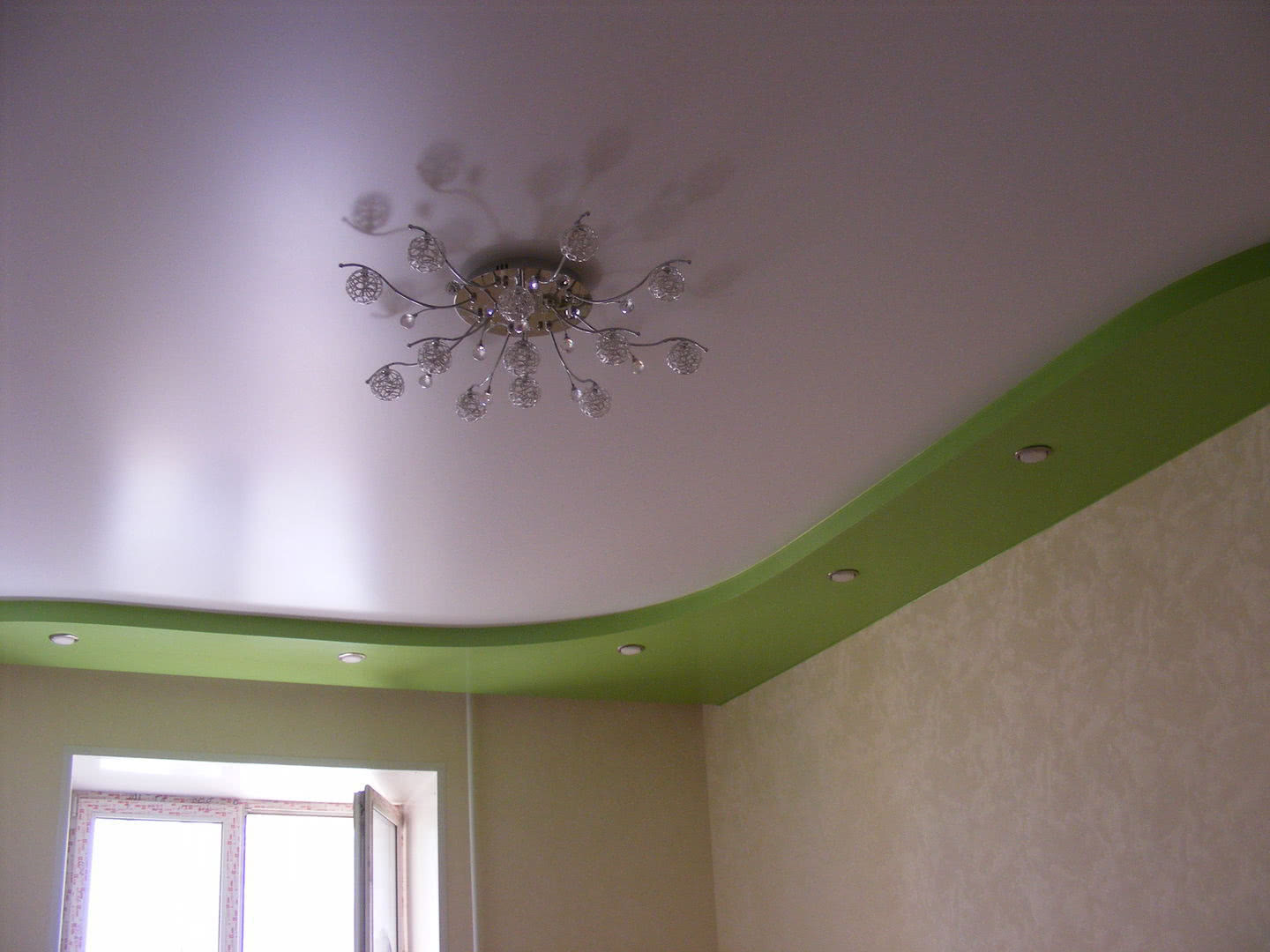 - Двухуровневый натяжной потолок с довольно сильным зеркальным эффектом.